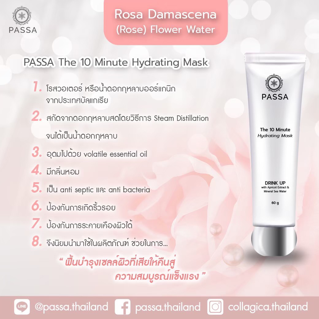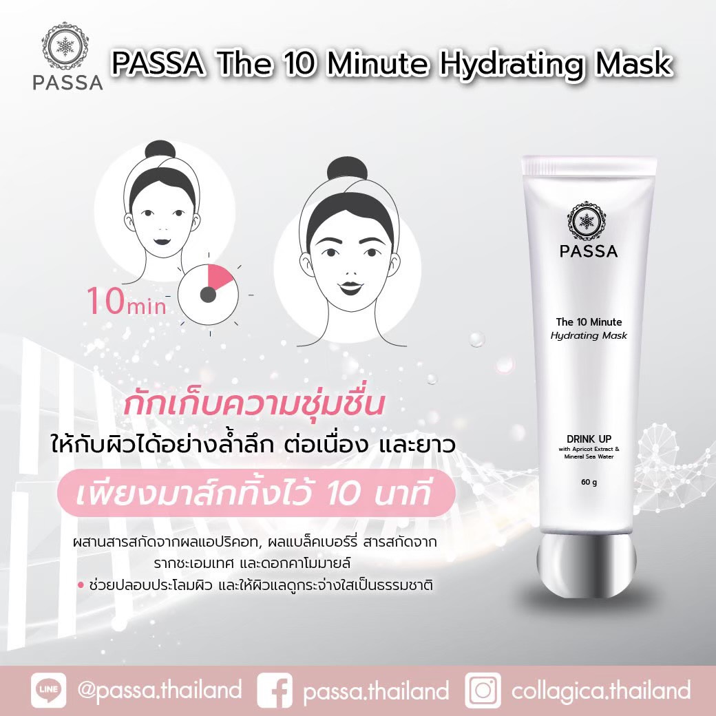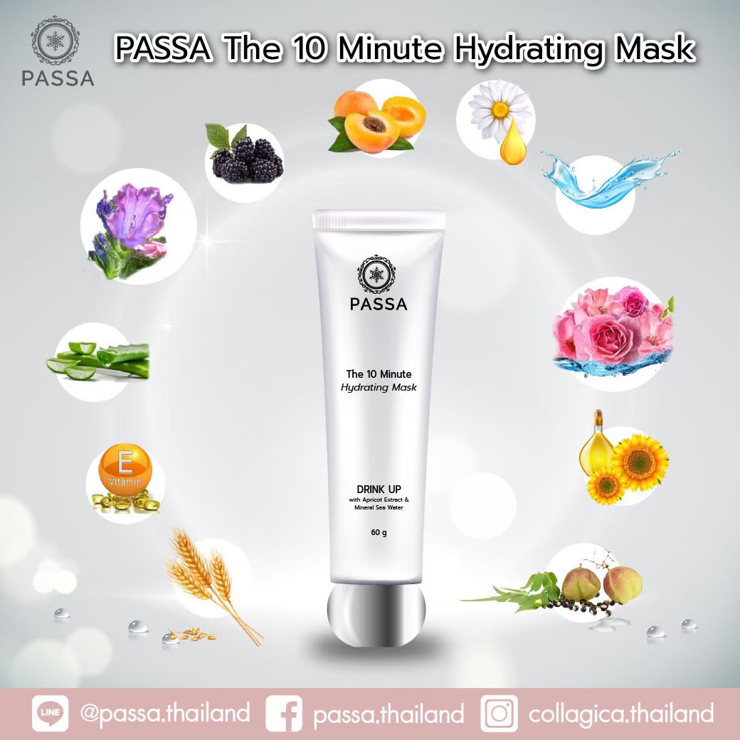 Passa The 10 Minute Hydrating Mask ครีมมาส์ก อุดมไปด้วยน้ำแร่ธรรมชาติจาก Mineral sea water และสารสกัดจากโมเลกุลน้ำตาล ชนิด D-Glucose คล้ายคลึงกับส่วนประกอบของมอยซ์เจอไรเซอร์ตามธรรมชาติที่เคลือบอยู่บนผิวของคนเรา (NMF) ผสานสารสกัดจากผลแอปริคอท, ผลแบล็คเบอร์รี่ สารสกัดจากรากชะเอมเทศ และดอกคาโมมายล์ เพียงแค่ 10 นาที “Drink Up” มอบความชุ่มชื้น ช่วยปลอบประโลมผิว และให้ผิวแลดูกระจ่างใสเป็นธรรมชาติ